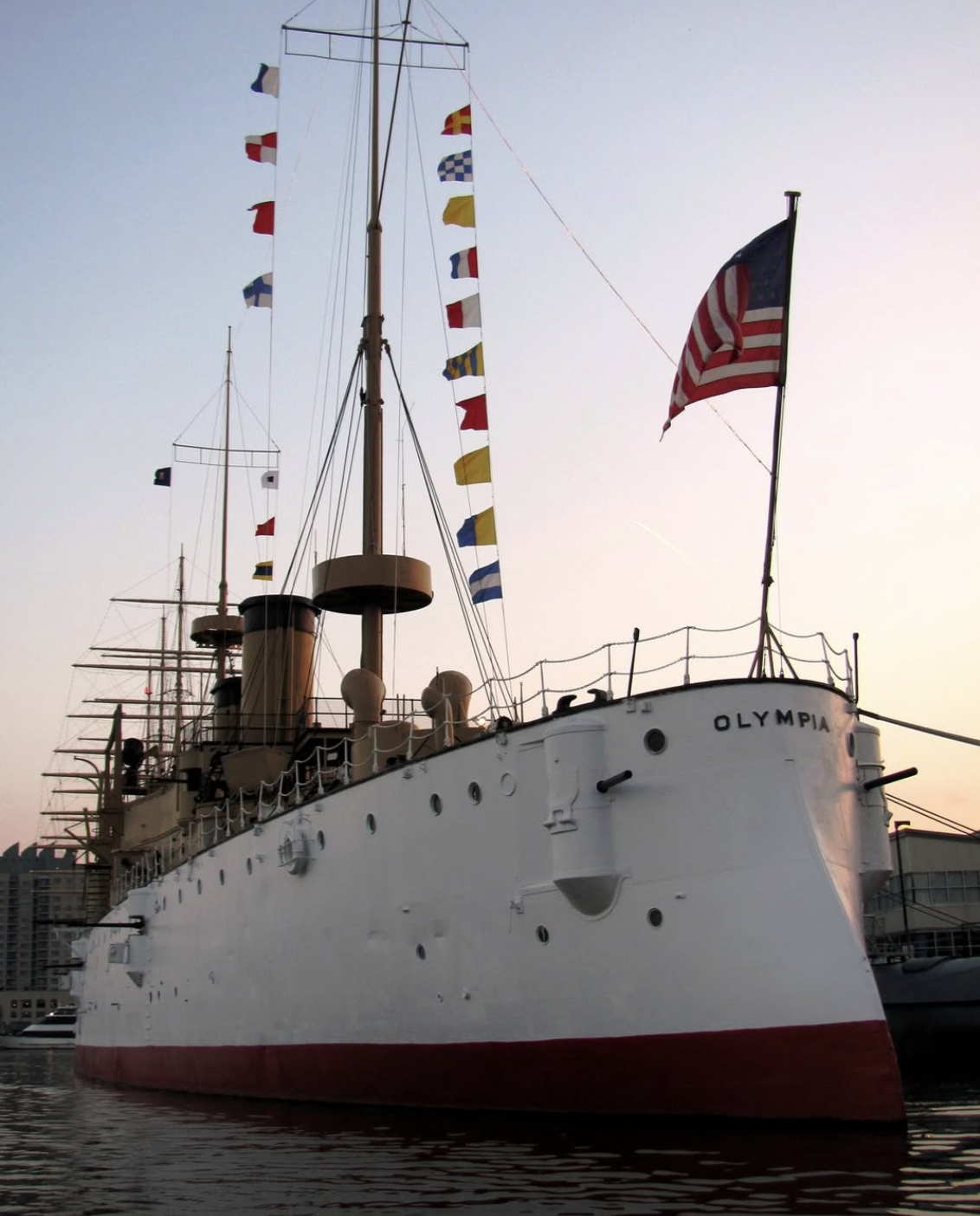 According to the Independence Seaport Museum’s Cruiser Olympia page, the ship is the oldest steel warship still afloat in the world. She served as Commodore George Dewey’s flagship in the Spanish–American War, saw action in World War I, and in 1921 carried the remains of the Unknown Soldier to Arlington National Cemetery.