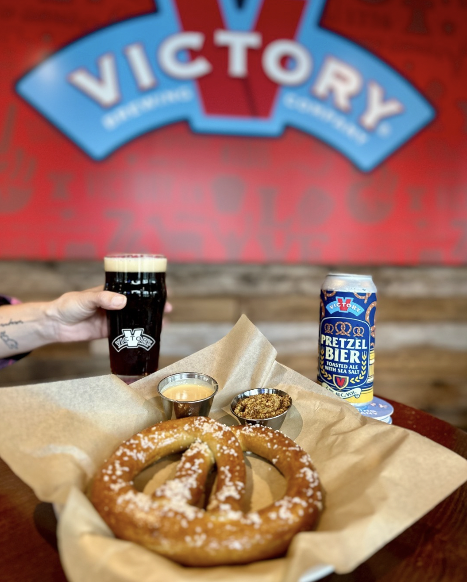 Victory’s Center City brew house brings polished energy and beer hall vibes. Their soft pretzel arrives with bold dipping options like beer cheese and whole grain mustard, which demands a crisp, clean beer to balance it. Enter the always reliably bright and refreshing Victory Pils.