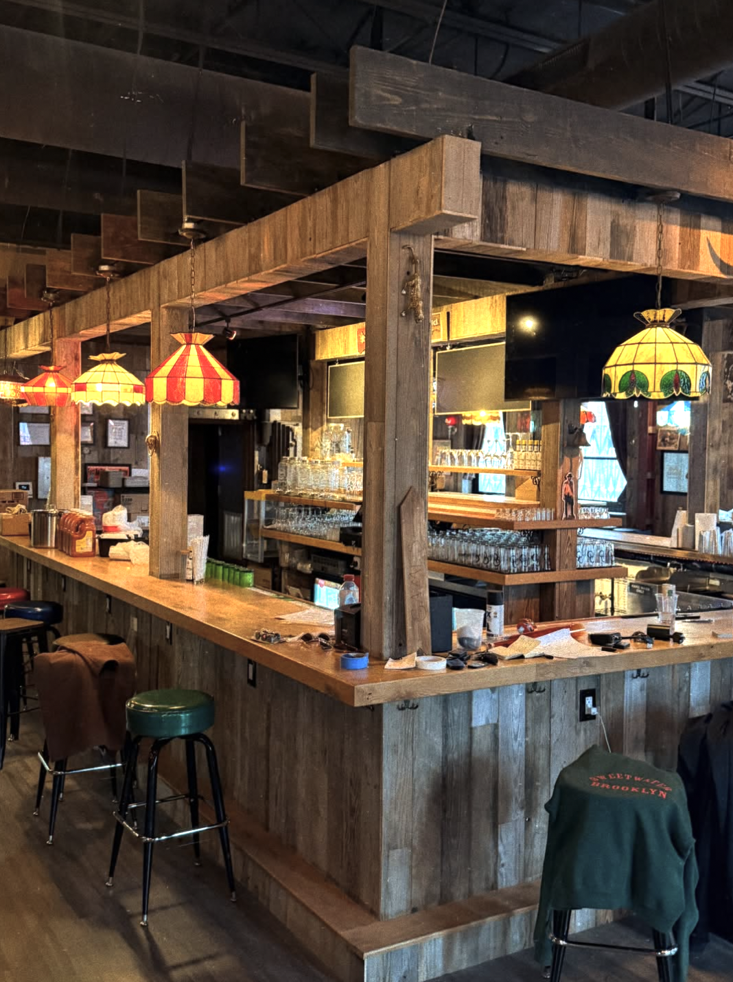 Let’s talk about the front half first. Walk in during the day, and you’re greeted not by bar noise but by racks of worn-in denim, boots, flannels, graphic tees, leather jackets, and carefully curated finds from several local vendors. The inventory seems to move fast, which is exactly what you want in a vintage store.